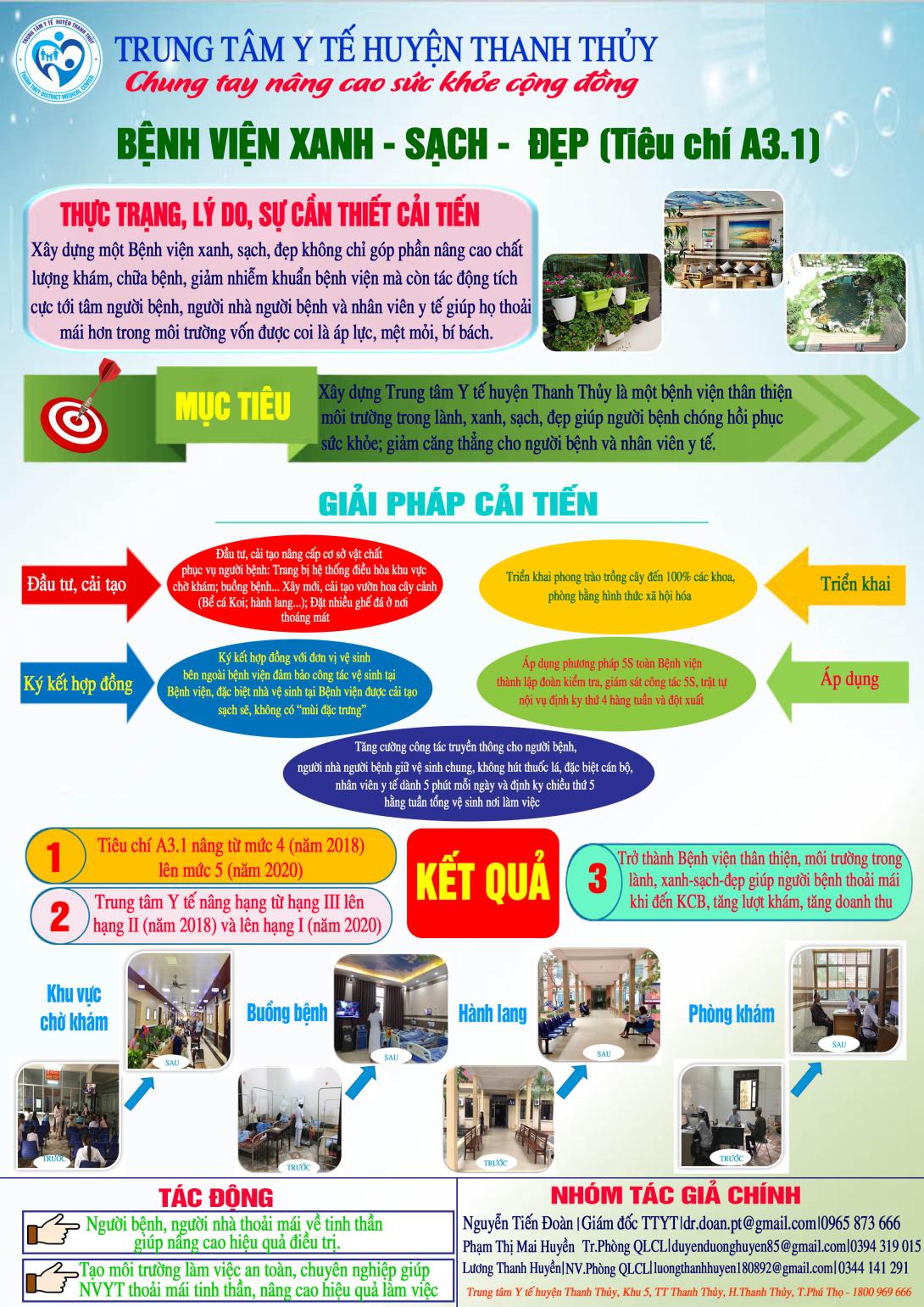 - Xây dựng Trung tâm Y tế huyện Thanh Thủy là một bệnh viện thân thiện môi trường trong lành, xanh, sạch, đẹp giúp người bệnh chóng hồi phục sức khỏe; giảm căng thắng cho người bệnh và nhân viên y tế.