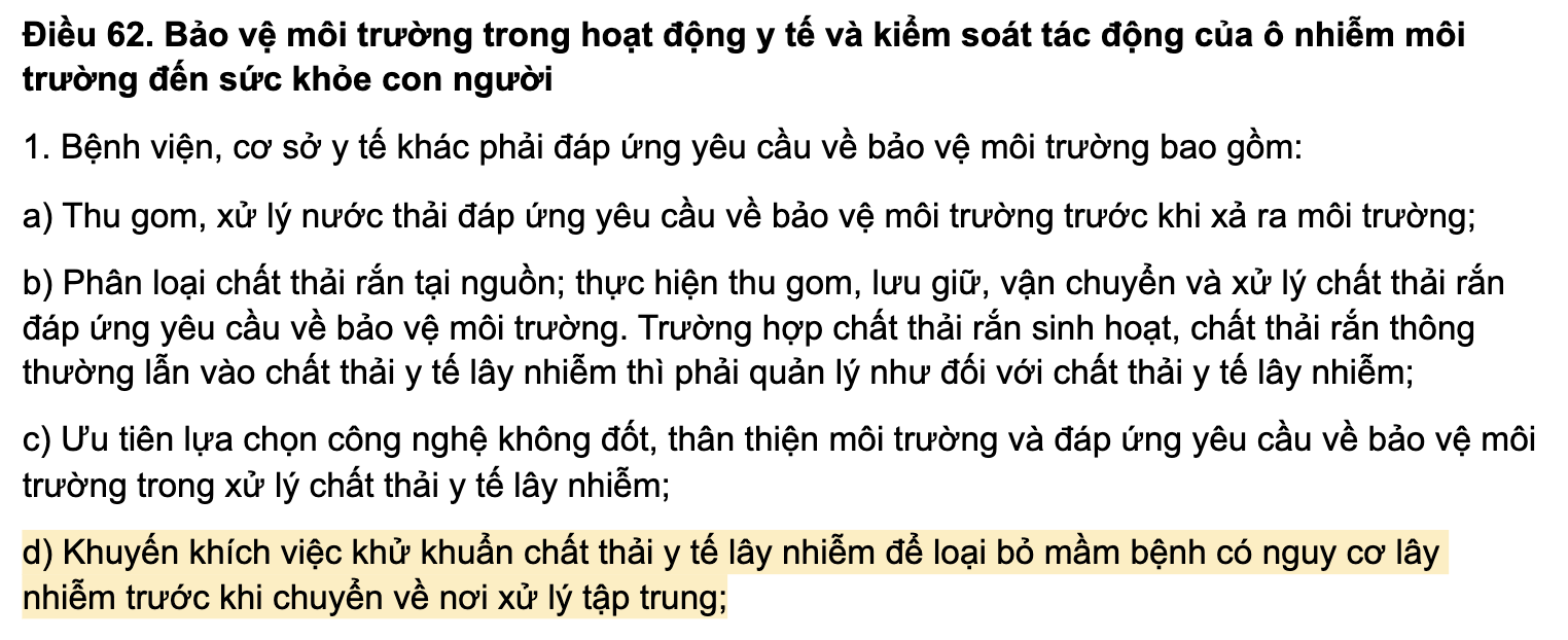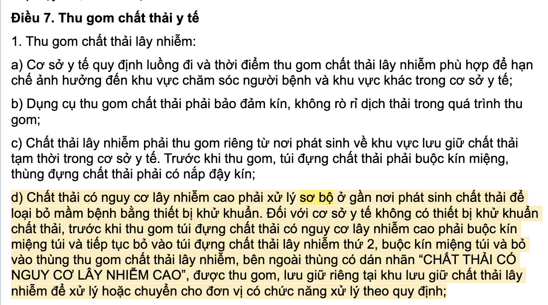 Theo Thông tư 20/2021/TT-BYT về quản lý chất thải y tế, nước thải phát sinh từ các cơ sở y tế (đặc biệt là nước thải có chứa yếu tố lây nhiễm cao từ phòng xét nghiệm) cần phải được khử khuẩn sơ bộ trước khi vận chuyển hoặc đưa vào hệ thống xử lý chung nếu có nguy cơ gây lây nhiễm ra môi trường.