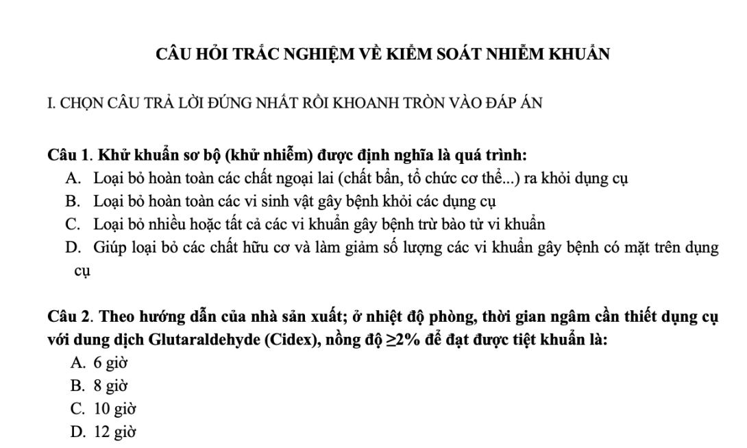 Đào tạo và tự đánh giá kiến thức là một phần quan trọng trong việc nâng cao năng lực kiểm soát nhiễm khuẩn (KSNK) tại bệnh viện. Nhằm hỗ trợ đội ngũ nhân viên y tế ôn tập, hệ thống hóa kiến thức và cập nhật các quy định mới, tài liệu “20 câu hỏi trắc nghiệm KSNK 2024” đã được biên soạn và sử dụng trong công tác huấn luyện, kiểm tra.