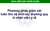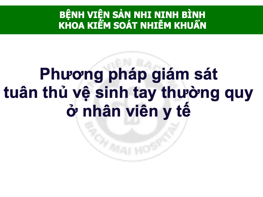 Tài liệu “Phương pháp giám sát tuân thủ vệ sinh tay thường quy ở nhân viên y tế” là bài giảng hướng dẫn thực hành chuẩn về giám sát vệ sinh tay (VST) – một trụ cột cốt lõi trong kiểm soát nhiễm khuẩn bệnh viện. Tài liệu tập trung vào cách tổ chức, phương pháp giám sát, cách ghi nhận cơ hội VST, thời điểm VST theo quy định của Bộ Y tế (dựa theo WHO), và cách tính tỷ lệ tuân thủ.