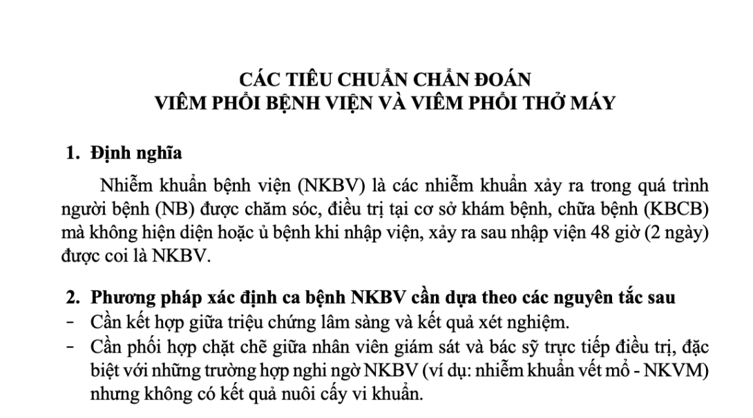 Tài liệu “Các tiêu chuẩn chẩn đoán viêm phổi bệnh viện và viêm phổi thở máy” tổng hợp dựa trên khuyến cáo quốc tế và Bộ Y tế, đưa ra hệ thống định nghĩa, tiêu chuẩn chẩn đoán và các tình huống loại trừ, giúp nhân viên y tế có cơ sở khoa học trong lâm sàng và giám sát.