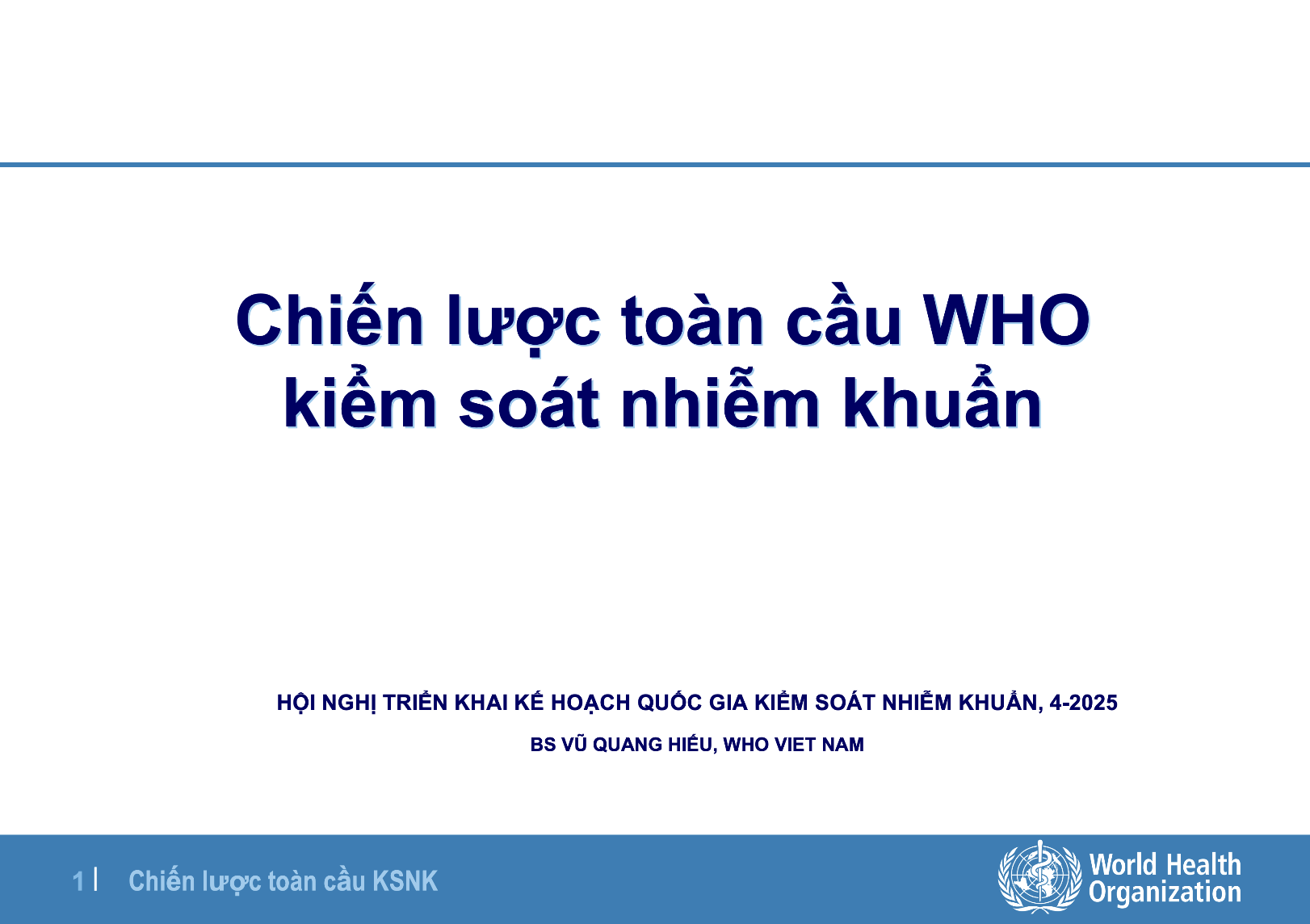 Tài liệu do BS. Vũ Quang Hiếu – WHO Việt Nam trình bày tại Hội nghị triển khai Kế hoạch quốc gia về Kiểm soát nhiễm khuẩn (KSNK) tháng 4/2025. Đây là một tham luận quan trọng, kết nối định hướng toàn cầu của WHO với thực tiễn Việt Nam.