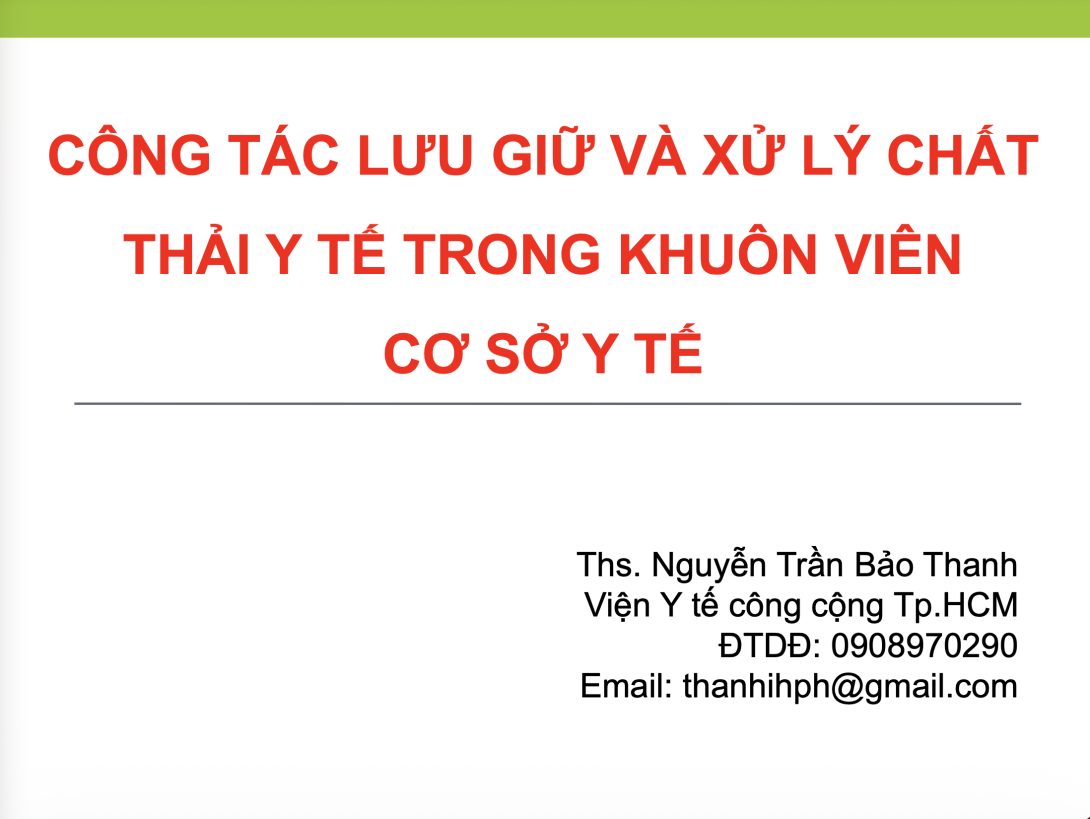 Tài liệu do ThS. Nguyễn Trần Bảo Thanh – Viện Y tế công cộng TP. Hồ Chí Minh biên soạn, tập trung vào nội dung hướng dẫn triển khai Thông tư 20/2021/TT-BYT của Bộ Y tế về quản lý chất thải y tế (CTYT) trong khuôn viên cơ sở y tế, có hiệu lực từ ngày 10/01/2022.