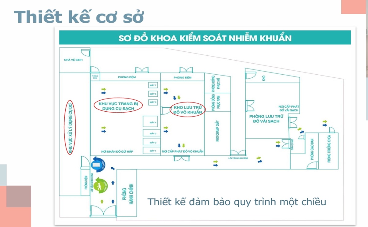 CSSD phải được thiết kế sao cho quy trình xử lý dụng cụ không bị giao thoa giữa sạch và bẩn, bao gồm các khu vực: