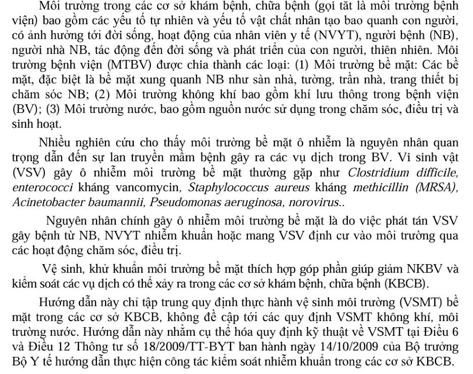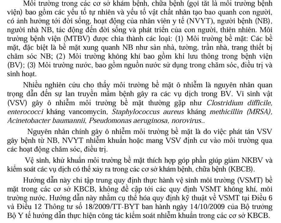 Tài liệu “Hướng dẫn vệ sinh môi trường bề mặt trong các cơ sở khám bệnh, chữa bệnh” (Bộ Y tế, 2017) được ban hành nhằm thống nhất quy trình vệ sinh, khử khuẩn bề mặt; giúp giảm thiểu nguy cơ lây truyền tác nhân gây bệnh, phòng ngừa nhiễm khuẩn bệnh viện và bảo đảm môi trường chăm sóc an toàn cho người bệnh và nhân viên y tế.