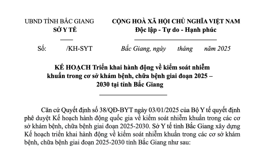 Nhằm thực hiện Quyết định số 38/QĐ-BYT ngày 03/01/2025 của Bộ Y tế về Kế hoạch hành động quốc gia kiểm soát nhiễm khuẩn (KSNK) giai đoạn 2025–2030, Sở Y tế Bắc Giang đã ban hành “Kế hoạch triển khai hành động về kiểm soát nhiễm khuẩn trong các cơ sở khám, chữa bệnh giai đoạn 2025–2030”.