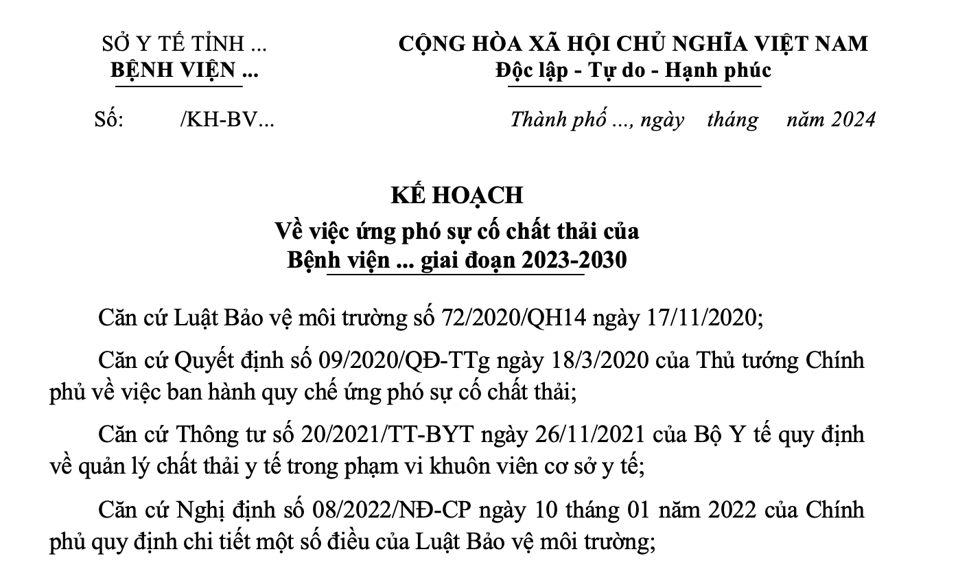 Mẫu “Kế hoạch ứng phó sự cố chất thải giai đoạn 2023–2030” là tài liệu đầy đủ và đáng tham khảo, giúp các bệnh viện xây dựng được bộ khung ứng phó sự cố môi trường bài bản và có tính thực hành cao.