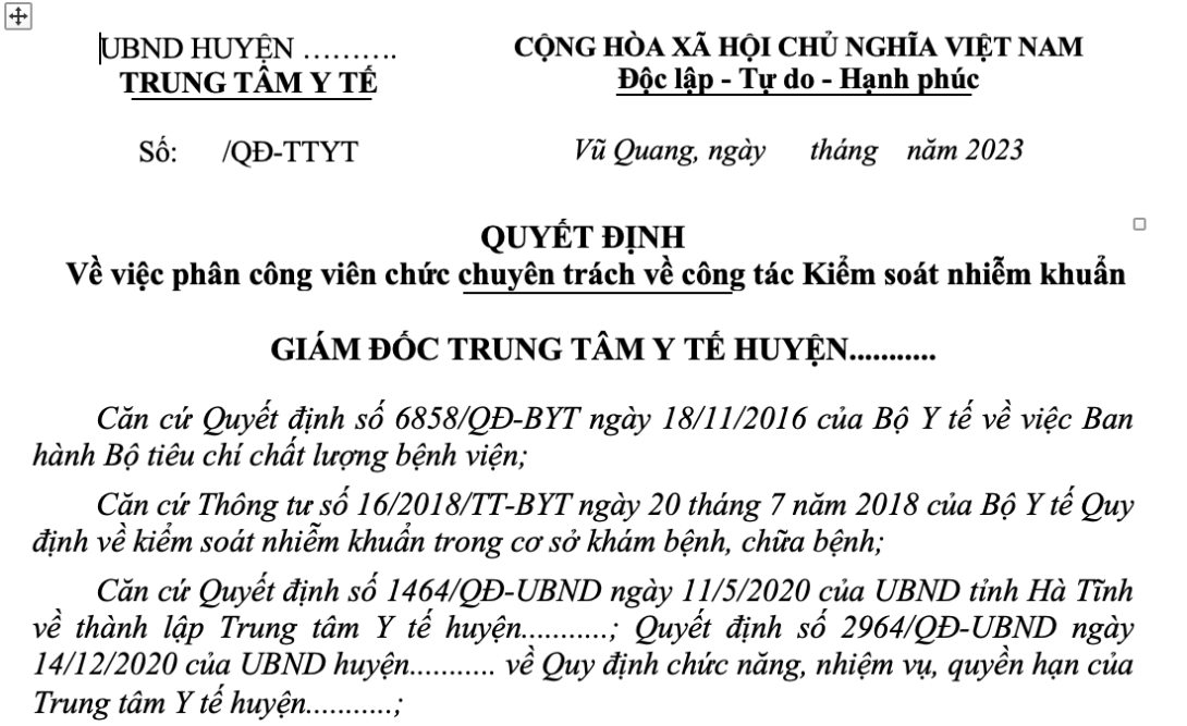 Mẫu Quyết định phân công viên chức chuyên trách Kiểm soát nhiễm khuẩn là văn bản hành chính quan trọng, giúp các Trung tâm Y tế, bệnh viện và cơ sở khám chữa bệnh thực hiện đúng quy định về tổ chức và nhân sự trong công tác Kiểm soát nhiễm khuẩn (KSNK).