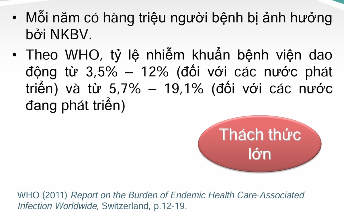 Nhiễm khuẩn bệnh viện (NKBV) là gánh nặng lớn đối với hệ thống chăm sóc sức khỏe. Theo Tổ chức Y tế Thế giới, tỷ lệ NKBV dao động từ 3,5% đến 12% tại các nước phát triển và từ 5,7% đến 19,1% tại các nước đang phát triển. NKBV làm tăng biến chứng, tử vong, kéo dài thời gian nằm viện và thúc đẩy đề kháng kháng sinh.