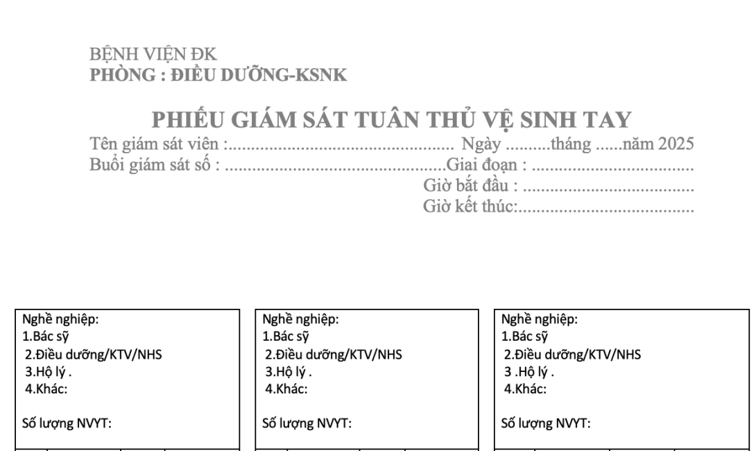 Tài liệu “Phiếu giám sát tuân thủ vệ sinh tay” do Bệnh viện Đa khoa. ..– Phòng Điều dưỡng & Kiểm soát nhiễm khuẩn xây dựng, là công cụ giúp chuẩn hóa việc theo dõi và đánh giá mức độ tuân thủ của nhân viên y tế.