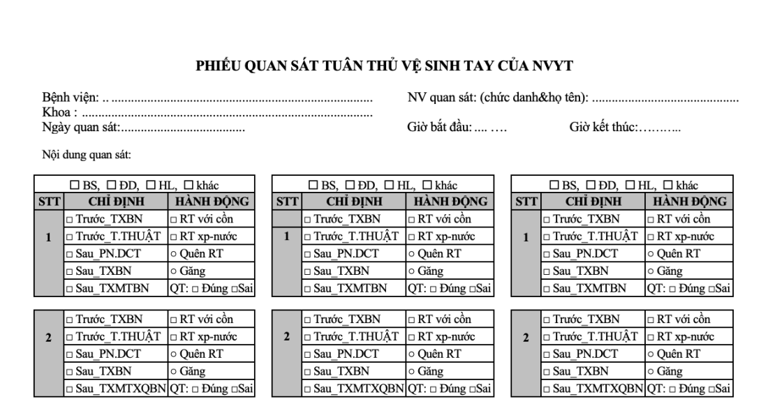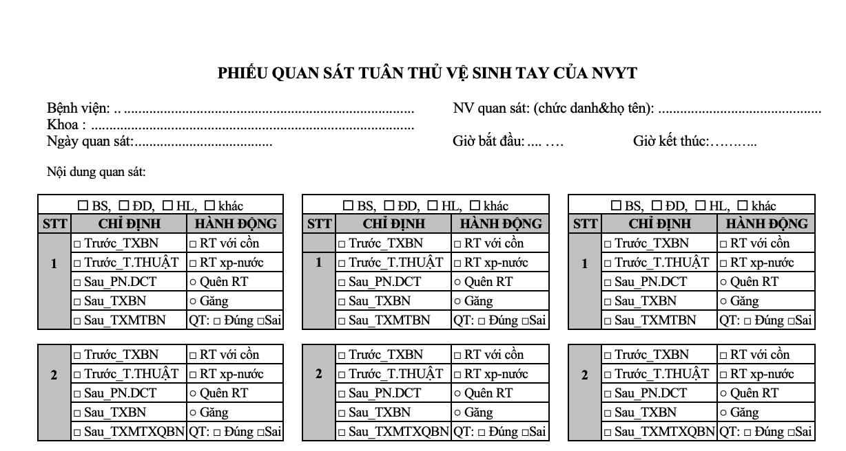 👉 Đây là công cụ giám sát thực hành quan trọng, cần được triển khai thường xuyên để duy trì văn hóa an toàn người bệnh và giảm thiểu nguy cơ nhiễm khuẩn bệnh viện.
