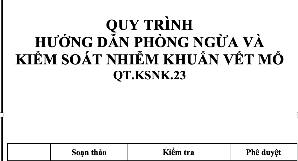 Nhiễm khuẩn vết mổ (NKVM) là một trong những nhiễm khuẩn bệnh viện phổ biến và nghiêm trọng, ảnh hưởng trực tiếp đến an toàn người bệnh sau phẫu thuật. Tài liệu QT.KSNK.23 được xây dựng nhằm chuẩn hóa quy trình phòng ngừa và kiểm soát NKVM, góp phần giảm tỷ lệ biến chứng, nâng cao chất lượng điều trị và bảo vệ nhân viên y tế.