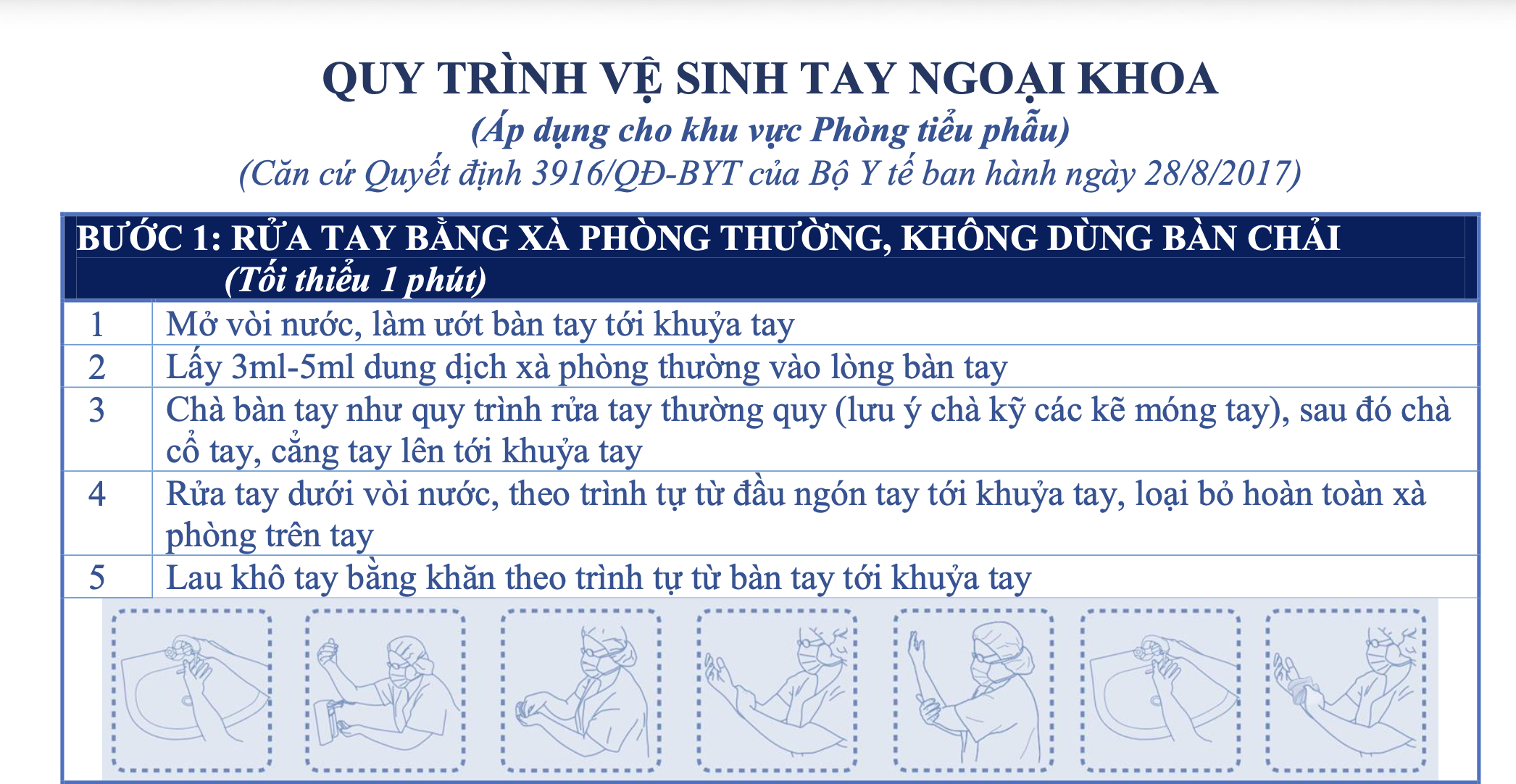 Tài liệu này được xây dựng căn cứ Quyết định số 3916/QĐ-BYT ngày 28/8/2017 của Bộ Y tế, áp dụng cho khu vực phòng tiểu phẫu, nhằm hướng dẫn chuẩn hóa quy trình vệ sinh tay ngoại khoa bằng dung dịch chứa cồn cho nhân viên y tế.