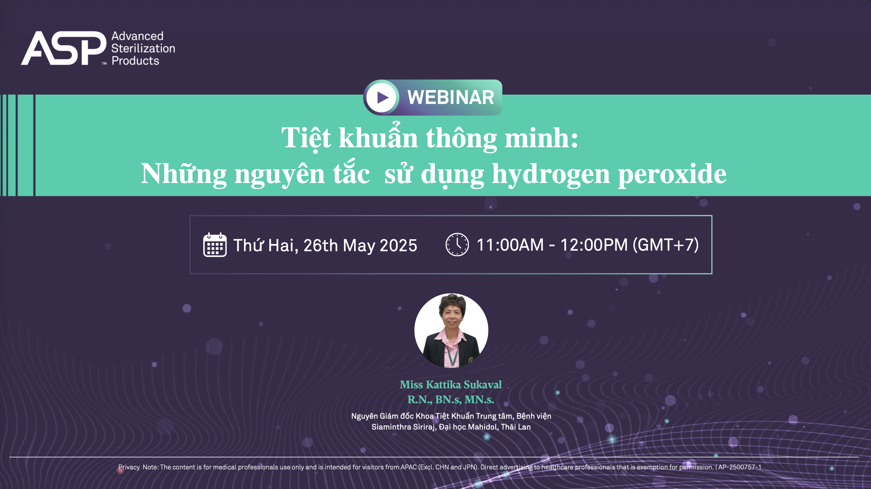 Ngày 26/5/2025, ASP (Advanced Sterilization Products) tổ chức Webinar chuyên đề “Tiệt khuẩn thông minh: Những nguyên tắc sử dụng hydrogen peroxide” với sự tham gia của bà Kattika Sukaval, R.N., BN.s, MN.s – Nguyên Giám đốc Khoa Tiệt khuẩn Trung tâm, Bệnh viện Siriraj, Đại học Mahidol, Thái Lan.