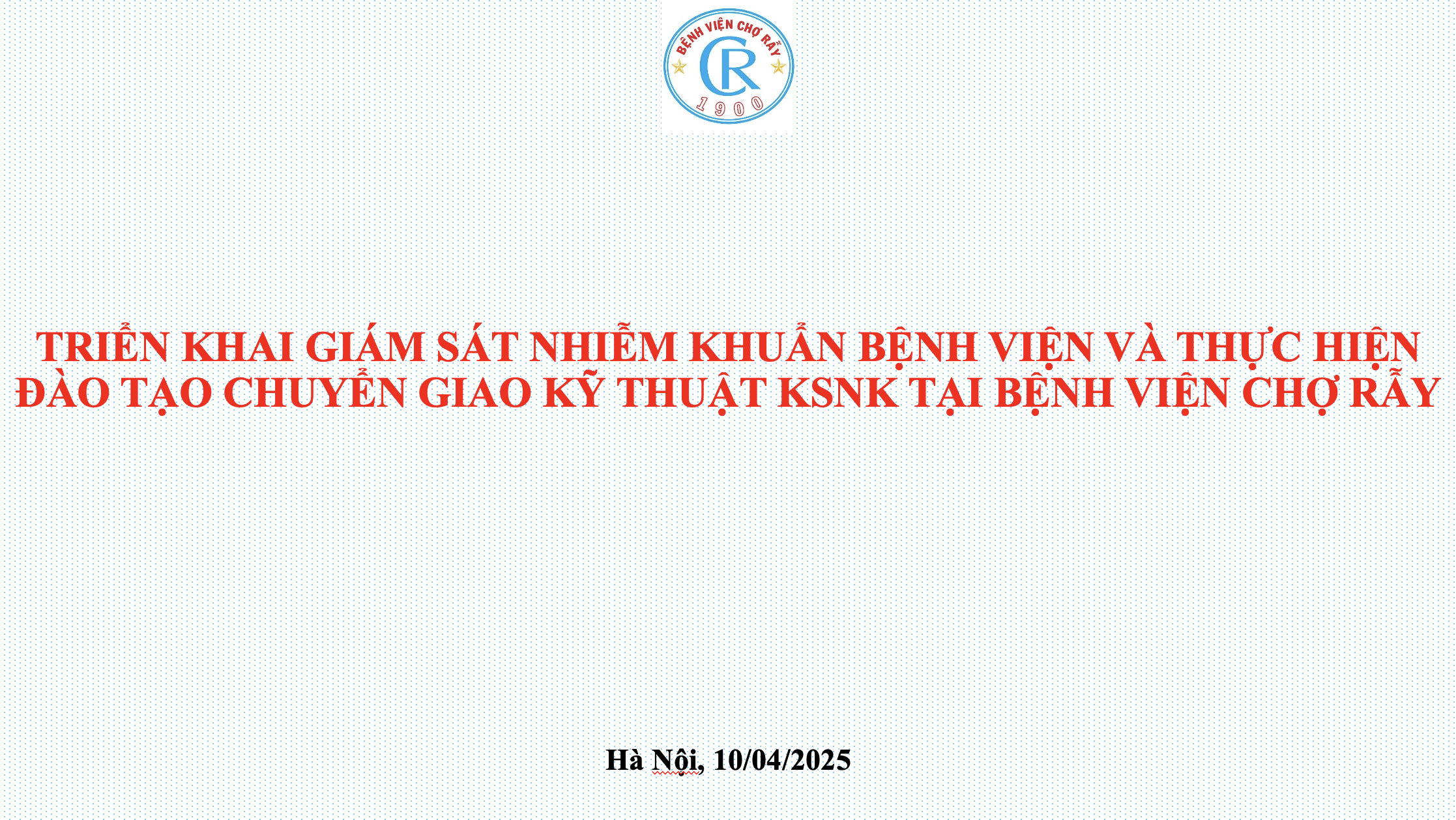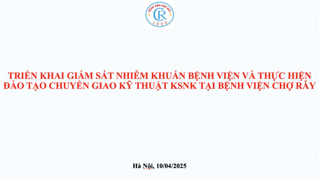 Ngày 10/4/2025, Bệnh viện Chợ Rẫy (BVCR) đã báo cáo kết quả và kế hoạch triển khai giám sát nhiễm khuẩn bệnh viện (NKBV) cùng hoạt động đào tạo, chuyển giao kỹ thuật kiểm soát nhiễm khuẩn (KSNK) theo chỉ đạo của Bộ Y tế. Đây là minh chứng cho vai trò đầu ngành của BVCR trong công tác KSNK, đồng thời góp phần thực hiện Kế hoạch hành động quốc gia KSNK giai đoạn 2025–2030.