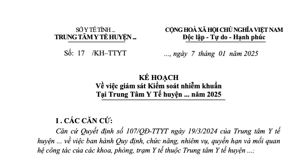 Ngày 07/01/2025, Trung tâm Y tế huyện … đã ban hành Kế hoạch số 17/KH-TTYT về giám sát Kiểm soát nhiễm khuẩn (KSNK) năm 2025. Đây là hoạt động quan trọng nhằm chuẩn hóa, nâng cao hiệu quả công tác phòng ngừa nhiễm khuẩn bệnh viện, góp phần bảo đảm an toàn người bệnh và nhân viên y tế.