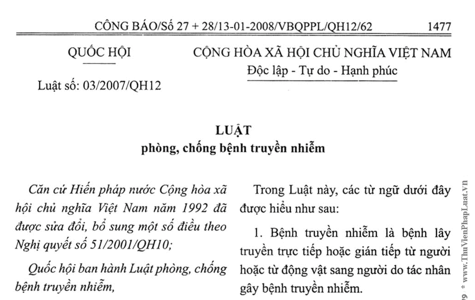 Quốc hội ban hành Luật phòng, chống bệnh truyền nhiễm.