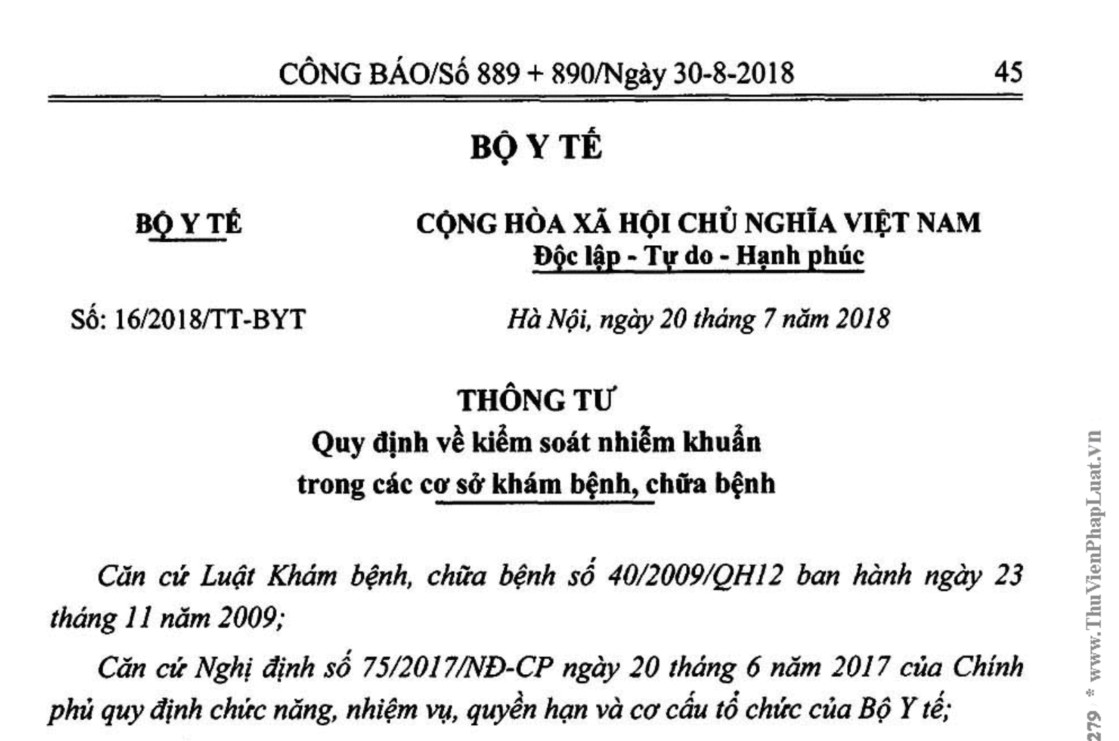 Số: 16/2018/TT-BYT | Hà Nội, ngày 20 tháng 7 năm 2018 |