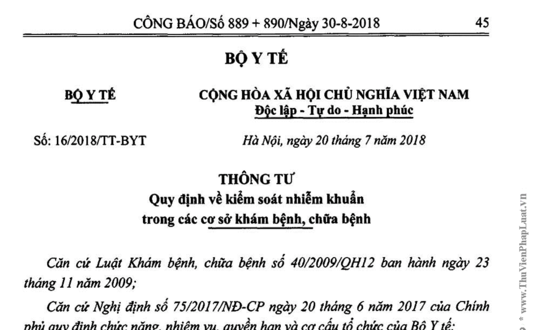Bộ trưởng Bộ Y tế ban hành Thông tư quy định về kiểm soát nhiễm khuẩn trong các cơ sở khám bệnh, chữa bệnh.