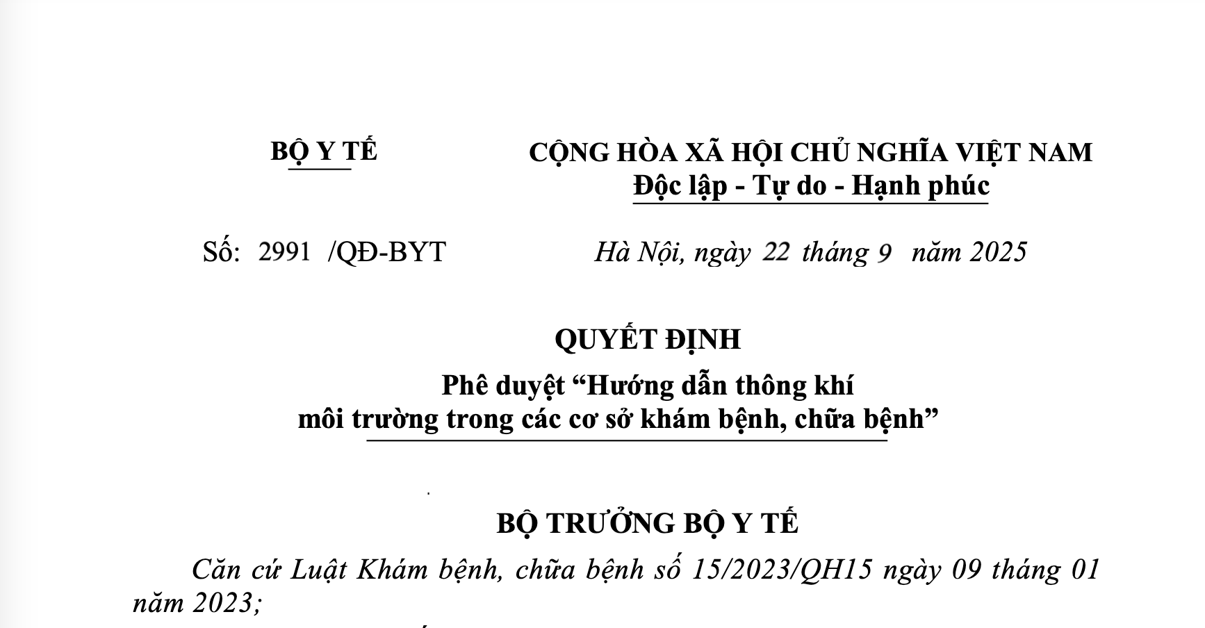 Số: 2991/QĐ-BYT | Hà Nội, ngày 22 tháng 9 năm 2025 |