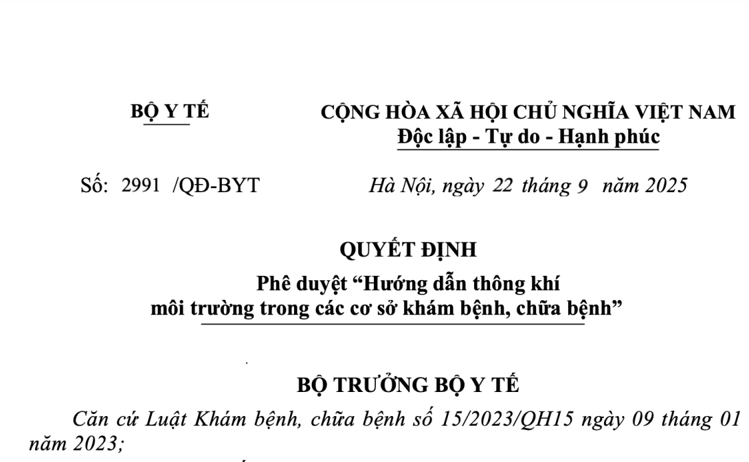 PHÊ DUYỆT “HƯỚNG DẪN THÔNG KHÍ MÔI TRƯỜNG TRONG CÁC CƠ SỞ KHÁM BỆNH, CHỮA BỆNH”