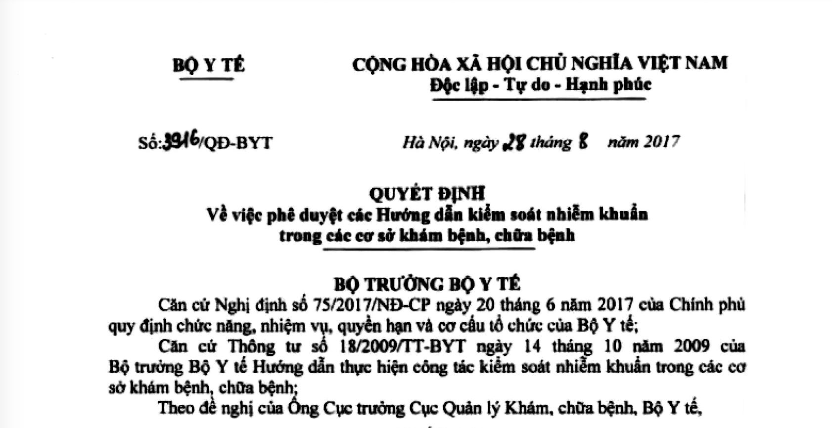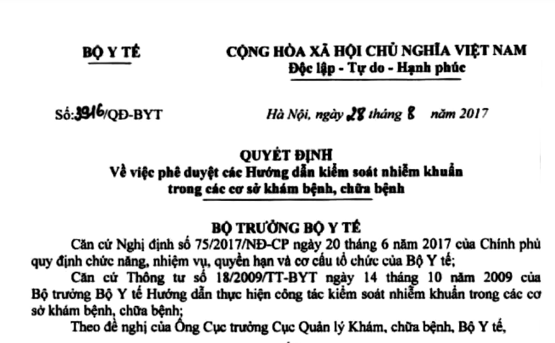 Căn cứ Thông tư số 18/2009/TT-BYT ngày 14 tháng 10 năm 2009 của Bộ trưởng Bộ Y tế Hướng dẫn thực hiện công tác kiểm soát nhiễm khuẩn trong các cơ sở khám bệnh, chữa bệnh;