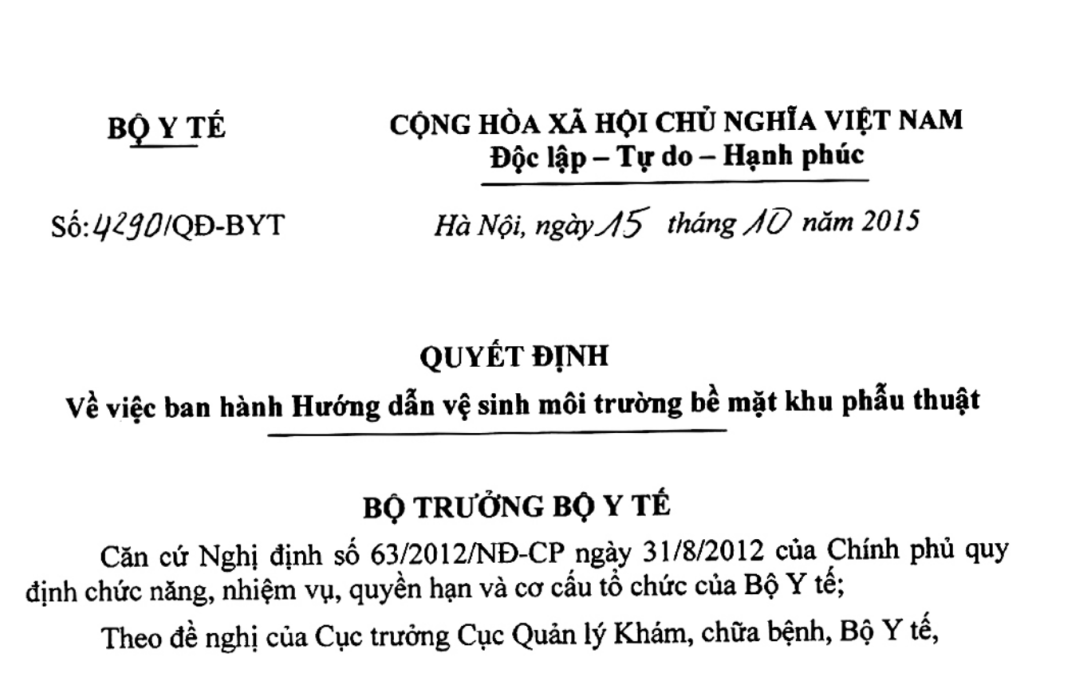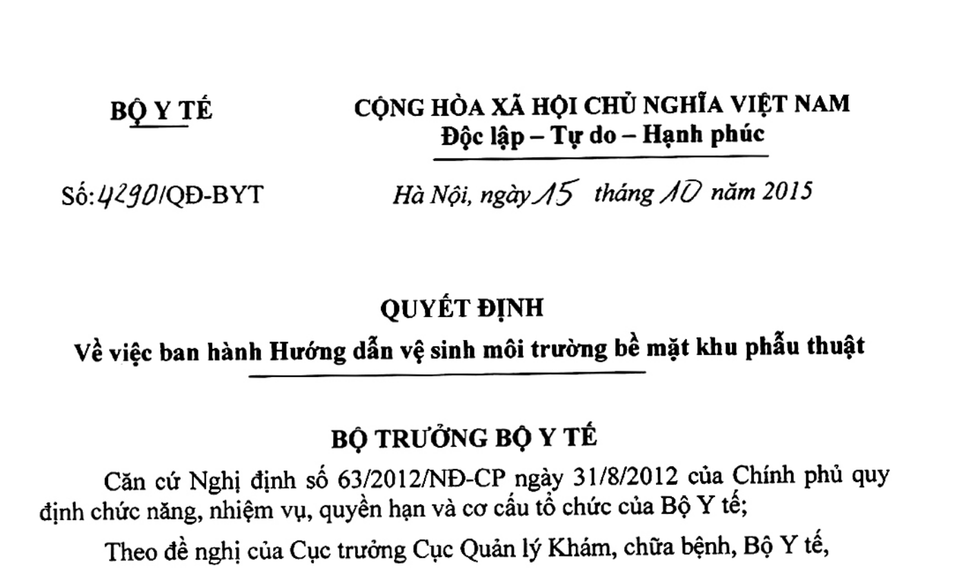 VỀ VIỆC BAN HÀNH HƯỚNG DẪN VỆ SINH MÔI TRƯỜNG BỀ MẶT KHU PHẪU THUẬT